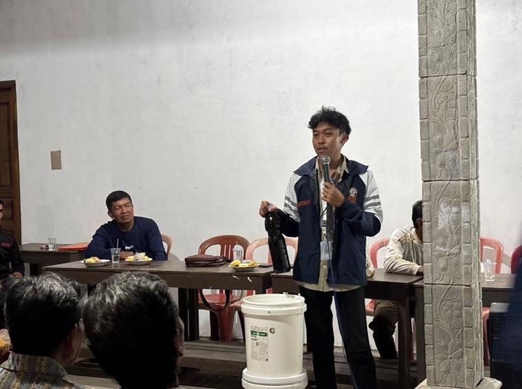Kegiatan ini mencakup pengenalan alat, bahan, serta langkah-langkah pembuatan pupuk kompos, sekaligus sosialisasi mengenai berbagai jenis sampah organik di Desa Perdamaian yang dapat dimanfaatkan sebagai bahan baku kompos. Dalam sesi demonstrasi, masyarakat diajarkan cara membuat kompos menggunakan limbah sayur dan buah, daun-daunan, bonggol pisang, serta kotoran sapi yang melimpah di desa tersebut. Proses fermentasi dipercepat dengan penambahan EM4 dan air sebagai aktivator.