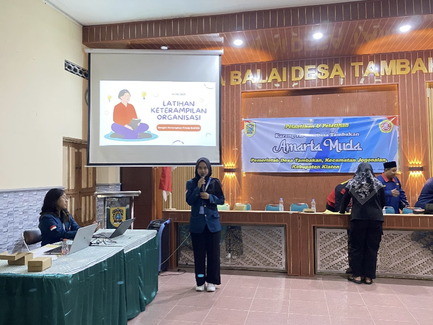 Karang Taruna Desa Tambakan memiliki nama Amarta Muda yang diharapkan dapat membangun desa melalui muda mudi desa. Pada tanggal 15 Januari 2025, organisasi tersebut dibentuk dan langsung dilantik oleh Kepala Desa Tambakan, Bapak Sunarno A.Md. Setelah itu, mahasiswa KKN melakukan latihan keterampilan organisasi kepada anggota karang taruna dengan harapan dapat menciptakan suasana kerja yang sehat. Selain itu, mereka juga mendapat materi mengenai kemampuan dasar yang diperlukan dalam organisasi